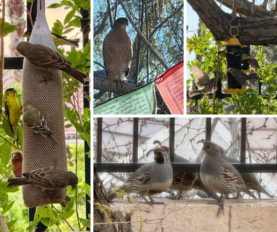 Lesser goldfinches and house finches chatter and jostle for space. Gambel’s quail wander through with their shy, curious presence, while Verdin dart about, busy with their intricate nests. Occasionally, Bullocks and Hooded orioles appear. Everything feels perfectly balanced.